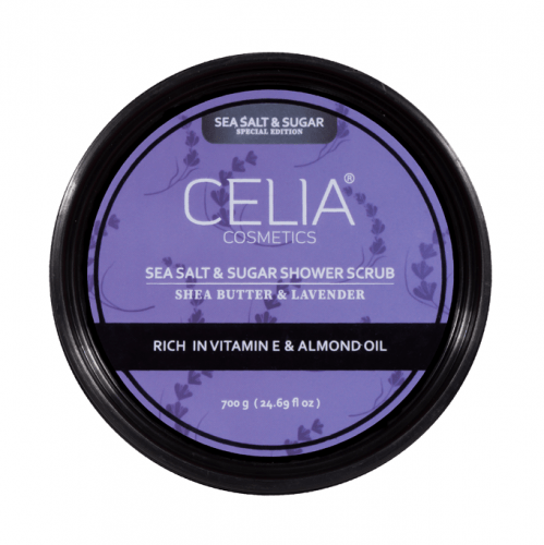 طريقة الاستخدام:أولاً: بللي جسمكِ بالماء الدافئ.ثانيًا: ضعي كمية من السكراب على جسمك، مع الفرك أو الدعك اللطيف وبحركات دائرية.ثالثًا: ستلاحظين ظهور طبقات الجلد الميت، اغسلي جسمكِ جيداً بالماء الفاتر للتخلص منها.رابعًا: ولنتائج أكثر تأثيرًا رطبي بشرتك بزبدة سيليا بعد استخدام السكراب.المكونات:ملح البحر : يساعد ملح البحر على إزالة الجلد الميت، وبالتالي يجعل البشرة أكثر حيوية من خلال تنشيط الدورة الدموية في الجسم. يعد ملح البحر منظفًا فعالًا للبشرة، فقد يساعد كثيرًا في مكافحة حب الشباب من خلال تطهير البشرة، غنيّ بالمعادن والمكوّنات التي تساعد على تنظيف البشرة والمسام من العمق وتعالج مختلف مشاكل البشرةالسكر :يعمل على إزالة جميع الأوساخ اليومية وخلايا الجلد الميتة بوجود مواد منظفة برغوة لطيفة تزيل الاوساخ دون ان تسبب الجفاف للبشرة وتعمل على تحسين لون بشرتك.زبدة الشيا:تعدّ من المرطبات الطبيعية والرائعة للبشرة حين تستخدم بشكل منتظم حيث تحمي البشرة وتضفي عليها الملمس اللين وتحميها من التجاعيد. تعمل على تنعيم الأماكن الخشنة في الجسم، مثل: منطقة الركبتين، ومنطقة الكوعين.زيت الارغان واللوز:هذه الزيوت تعالج مشكلة جفاف البشرة، ويرطب البشرة بعمق، فالبشرة تمتصه بشكل سريع، لذا تحتفظ بالرطوبة في داخلها لأطول فترة ممكنة.فيتامين E:يعتبر فيتامين e من الفيتامينات الضرورية من اجل الحفاظ على صحة البشرة، وتعزيز عمل الجهاز المناعي للجسم. حيث يساعد فيتامين هـ على حماية البشرة من علامات الشيخوخة المبكرة، واضرار اشعة الشمس فوق البنفسجية، والالتهابات.زيت جوز الهند:يحتوي على أحماض دهنية تساعد على تغذية وحماية البشرة، وتشمل حمض اللينوليك (Linoleic acid) والذي يُساعد على تقوية الطبقة الواقية للجلد والسماح لها بالاحتفاظ بالرطوبة. أنه يغذي بعمق البشرة، كما يمكن أن يمتصه الجلد بكل سهولة وبالتالي يُساعد على إصلاح البشرة التالفة بشكل أفضل. يساعد في التخفيف من ظهور البقع الداكنة وتفتيح لون البشرة، لاحتوائه على فيتامين هـ ومضادات الأكسدة والتي تعمل على تجديد البشرة.خلاصة اللافندر:المساهمة في ترطيب البشرة والتخفيف من جفافها و تقليل خطر إصابة البشرة بالعدوى من الجراثيم والميكروبات. قد تساعد على التخفيف من حب الشباب والبثور والتخفيف من آثارهما. المساهمة في تنظف مسامات البشرة. يمكن أن تساعد على زيادة نعومة ونضارة ورطوبة ولمعان البشرة.