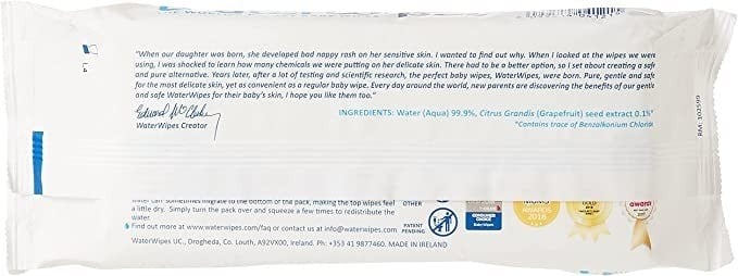 آمنة على البشرة الحساسة ممتازة لتنظيف بشرة الأطفال الرقيقة، مناديل ووتر وايبس لبشرة الأطفال الحساسة لطيفة بما يكفي للاستخدام حتى على بشرة الأطفال من الولادة المبكرة معتمدة للاستخدام من قبل جمعية اليرجي يو كيه.مناسبة للأطفال منذ الولادة. مناديل ووتر وايبس الأنقى للأطفال الرضع على مستوى العالم. رائع لبشرة الطفل الحساسة، والطفل الذي يكون في أول مشيته أو مكتمل النمو. تعتبر بديلاً مناسبًا للقطن الطبي والماء.تحتوي على مكونين فقط. تحتوي على 99.9% ماء وقطرة من مستخلص الفاكهة. يعمل مستخلص الفاكهة كمرطب لطيف للبشرة.مناديل مبللة متعددة الاستخدامات. يمكنك استخدام هذه المناديل الرائعة لتنظيف يدي ووجه طفلك أثناء فترتي الفطام والتسنين، كما أنها ملائمة للبالغين والكبار ذوي البشرة الحساسة، ومن السهل أخذ مناديل ووتر وايبس معك خلال السفر.تبعد الجراثيم والروائح.لا تسبب الحساسية للجلد.رائعة لطفح الحفاضات وغيره من أمراض البشرة الحساسة مثل الاكزيما أو الصدفية.
